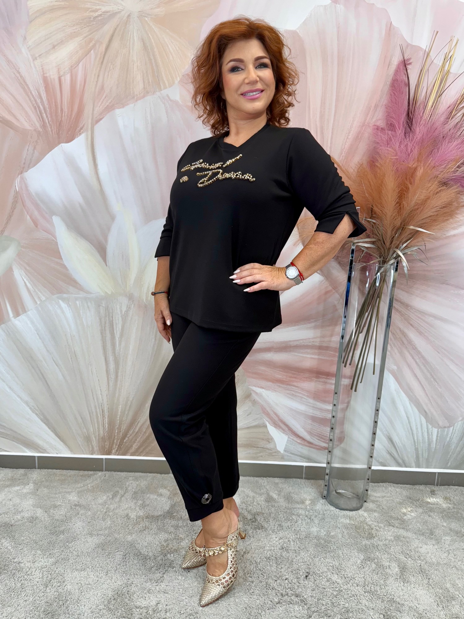 2025.09.04.Fekete puha pamut felső arany kristályokkal és strasszokkal