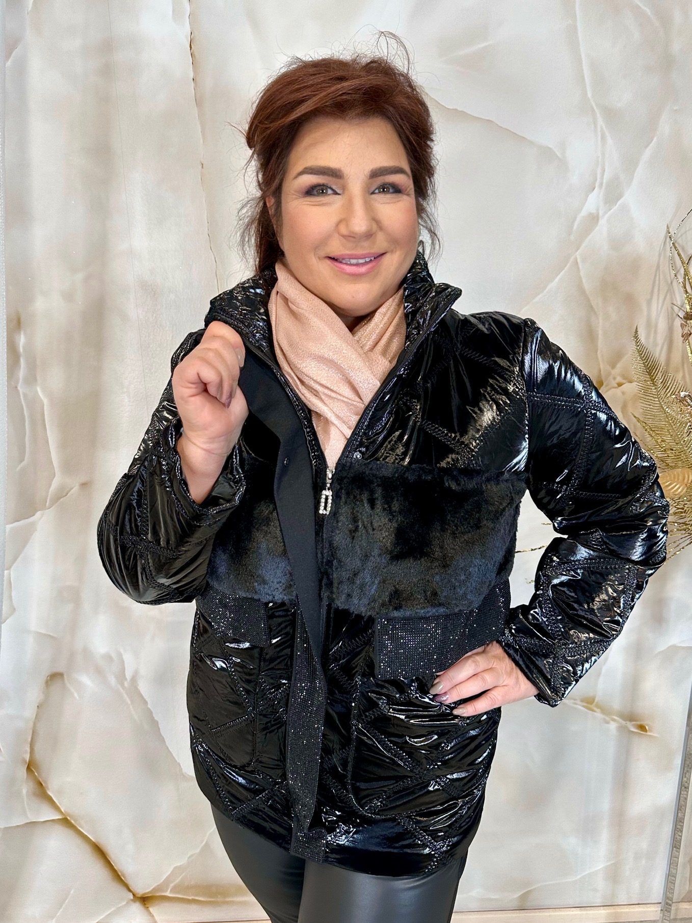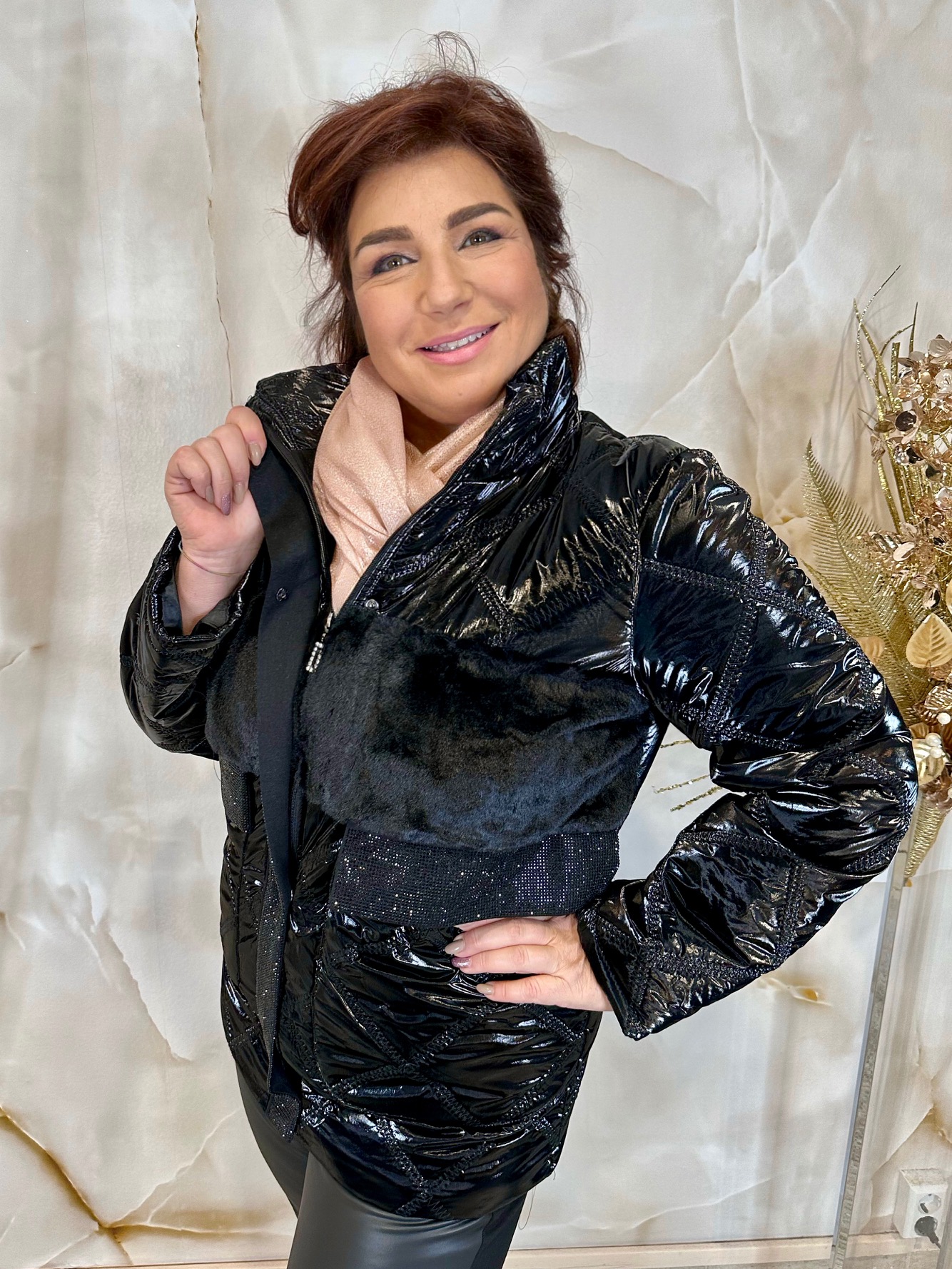 Fekete rövid selyemfényű kabát szőrmével, kristályokkal, zipzárral