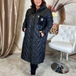 Fekete hosszú kabát mellén kristályos zsebbel, oldalán felzippelhető (52-58)