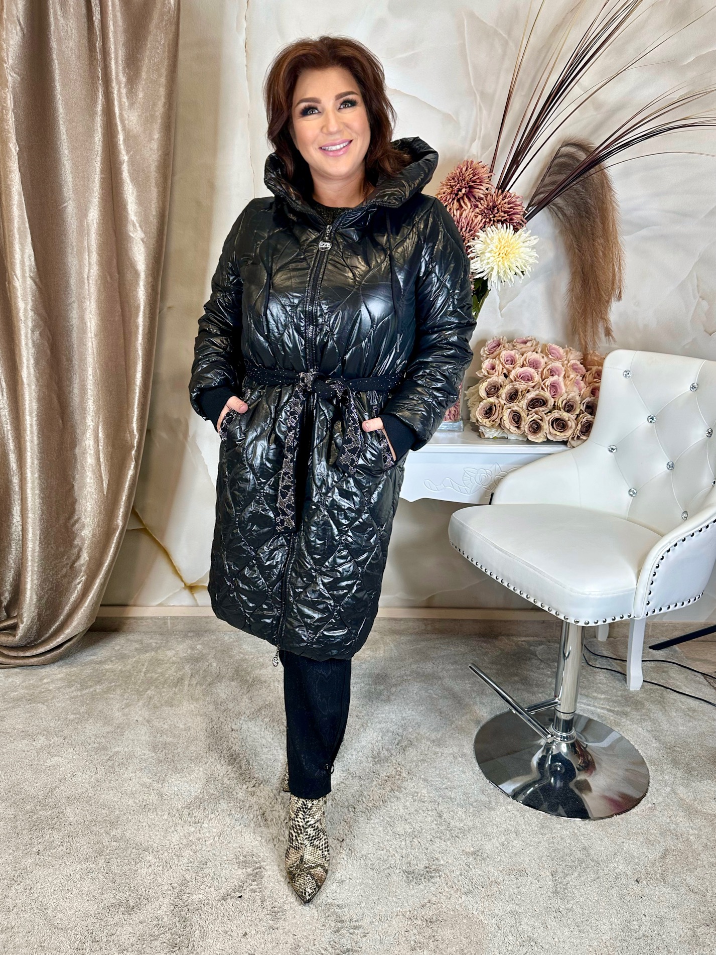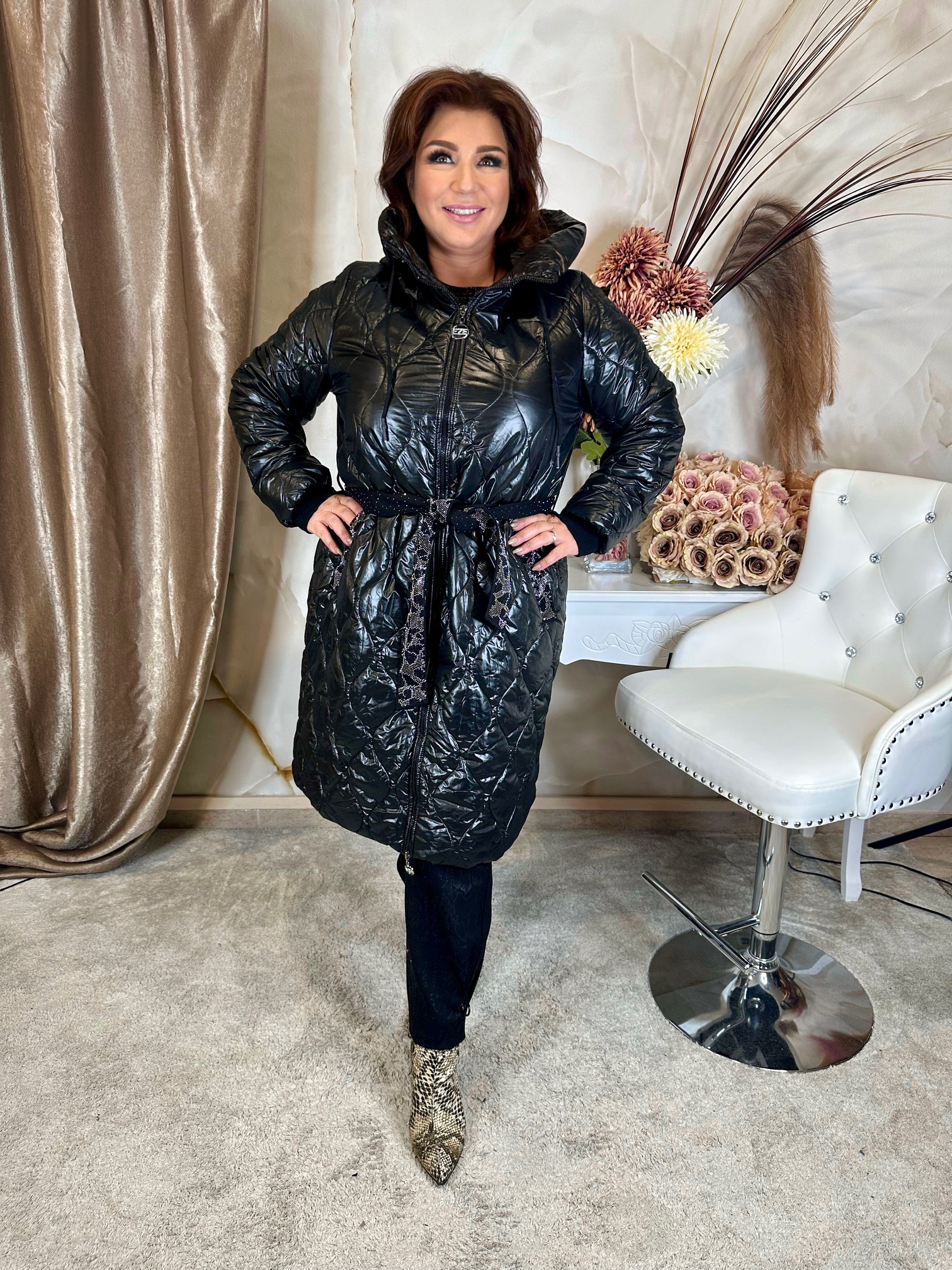 Fekete selyemfényű steppelt kabát, ezüst kristályokkal, levehető övvel