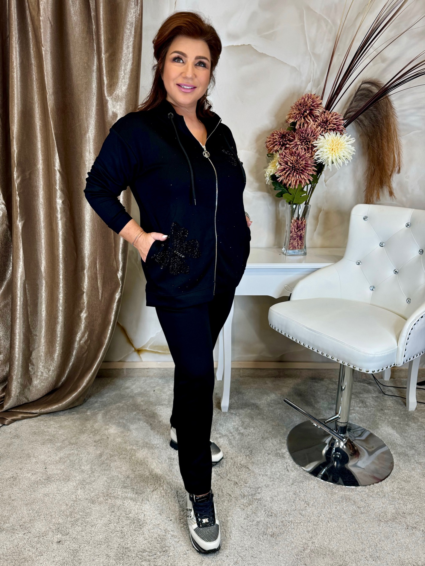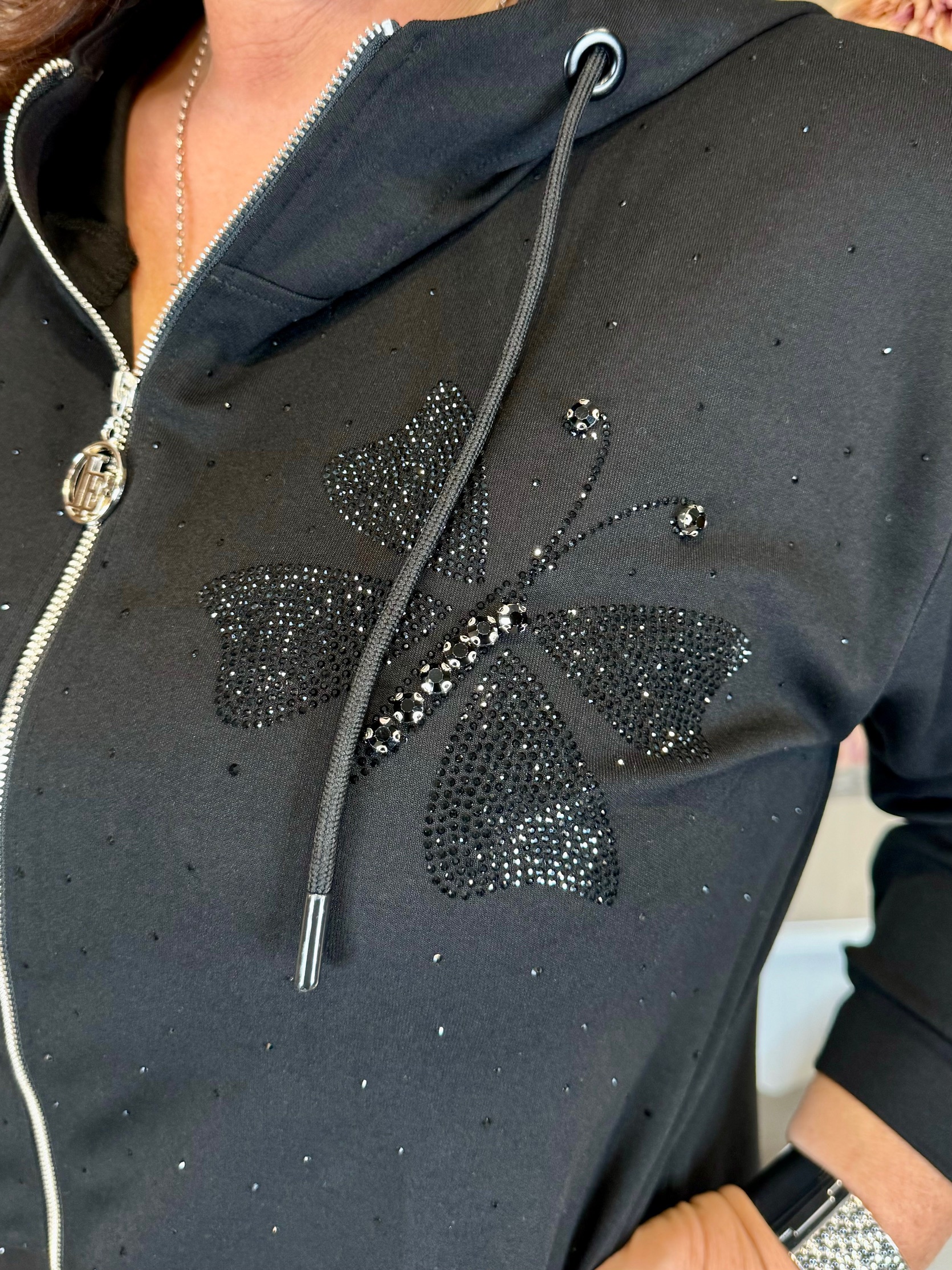 Fekete szabadidő szett pillangókkal, kapucnival, kristályokkal, fekete gumis derekú nadrággal, elasztikus pamutból