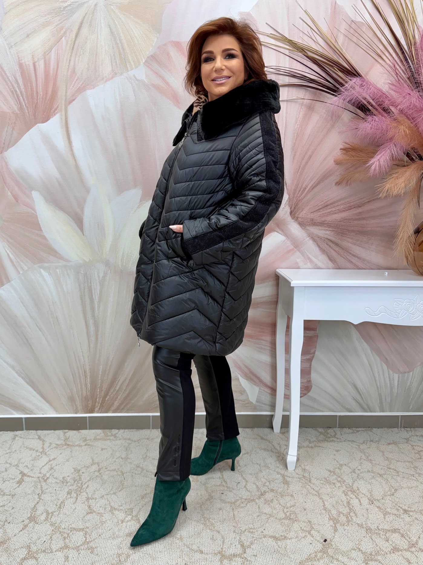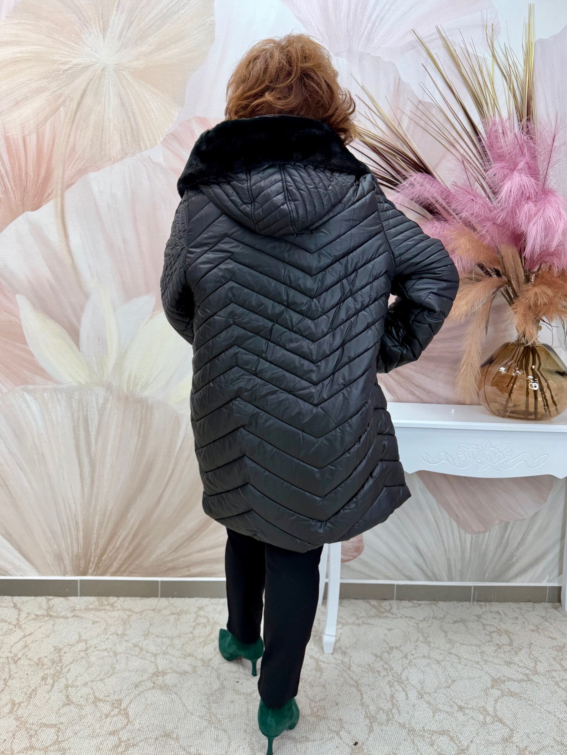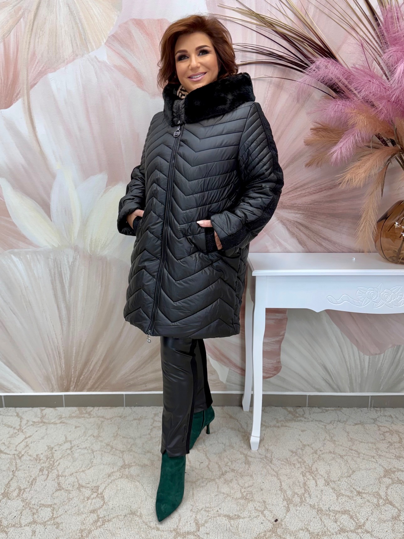 2025.11.20.Fekete szőrmegalléros télikabát fekete kristályokkal