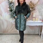 Felül szőrmés olívazöld selyemfényű télikabát kristályokkal