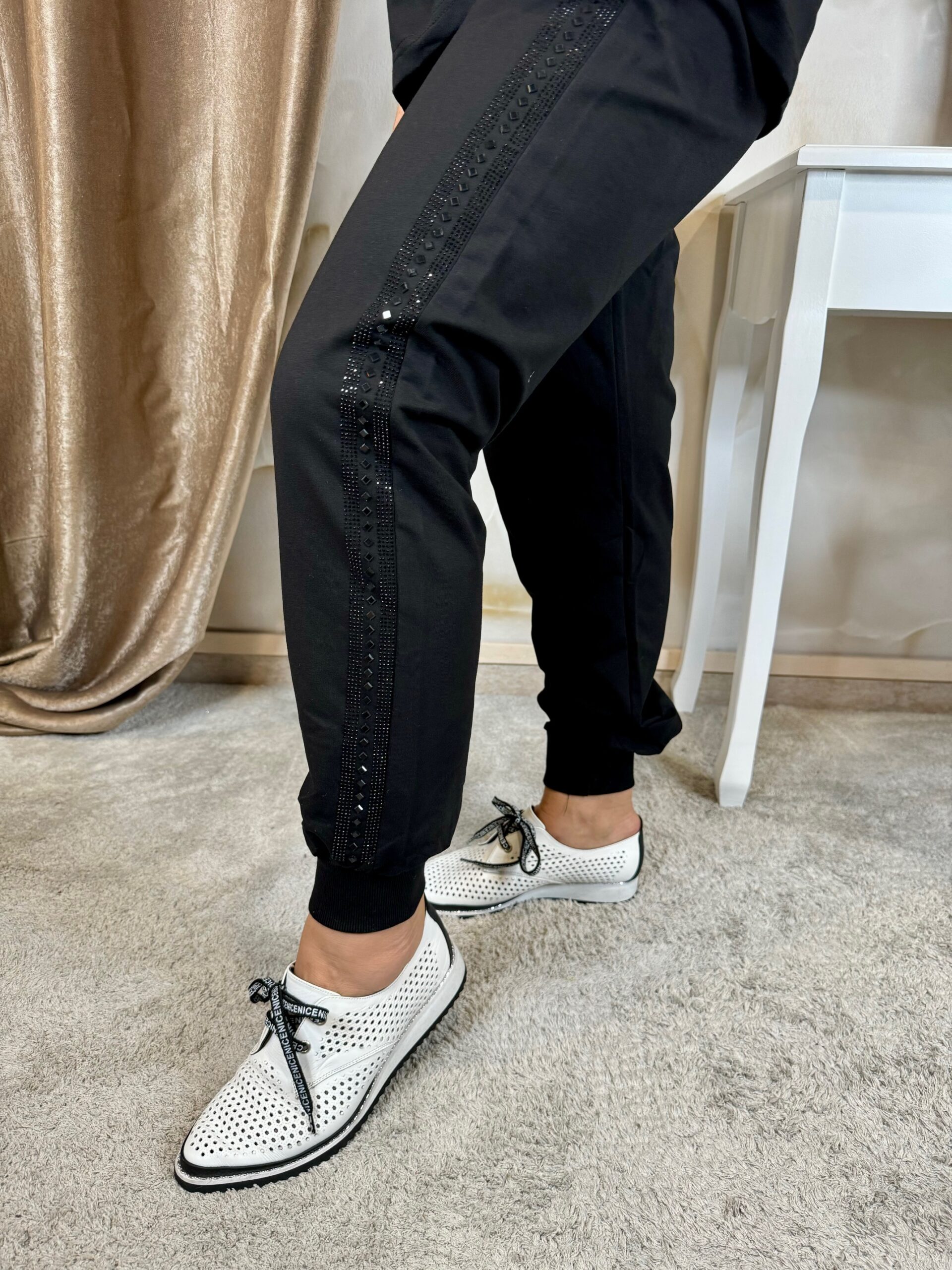 Fekete gumis derekú nadrággal, fekete kapucnis felsővel, fekete kristályokkal, elasztikus pamutból