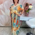 V nyakú bézs maxiruha – női mintás