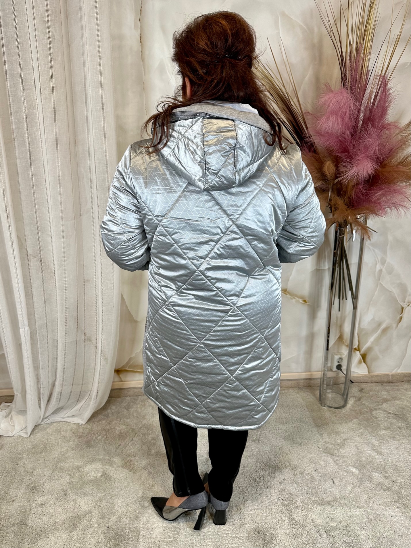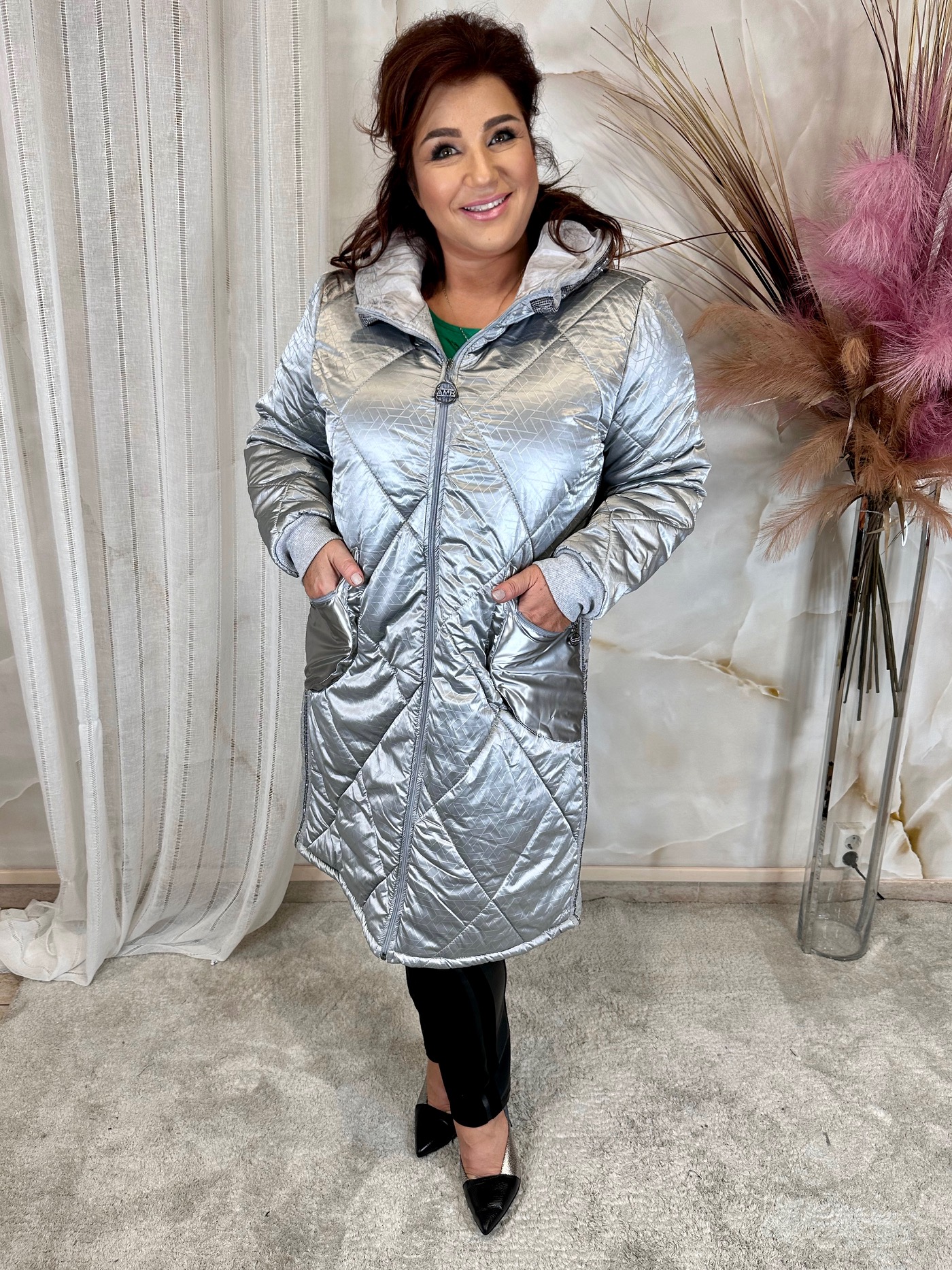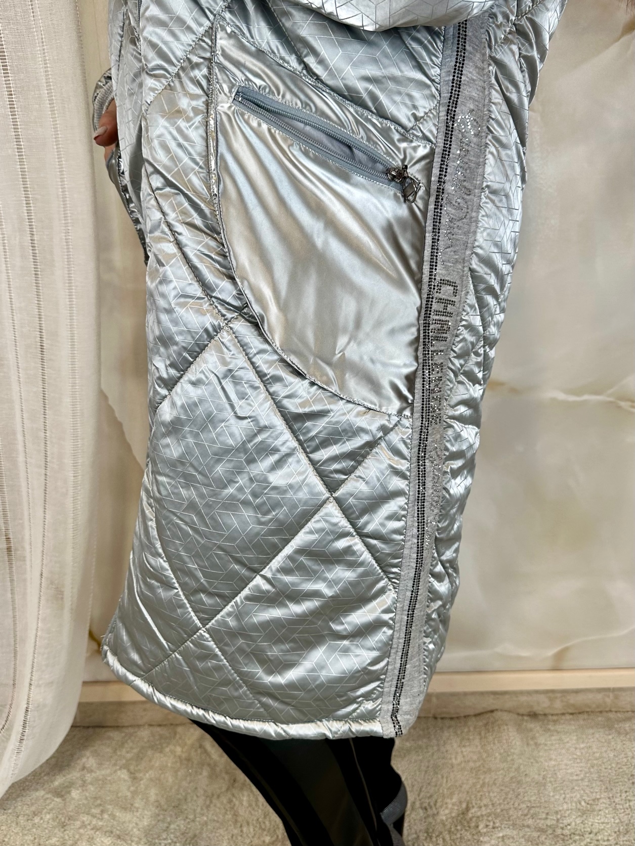 2024.10.10.Hosszú ezüst selyemfényű kabát kapucnival, kristályokkal