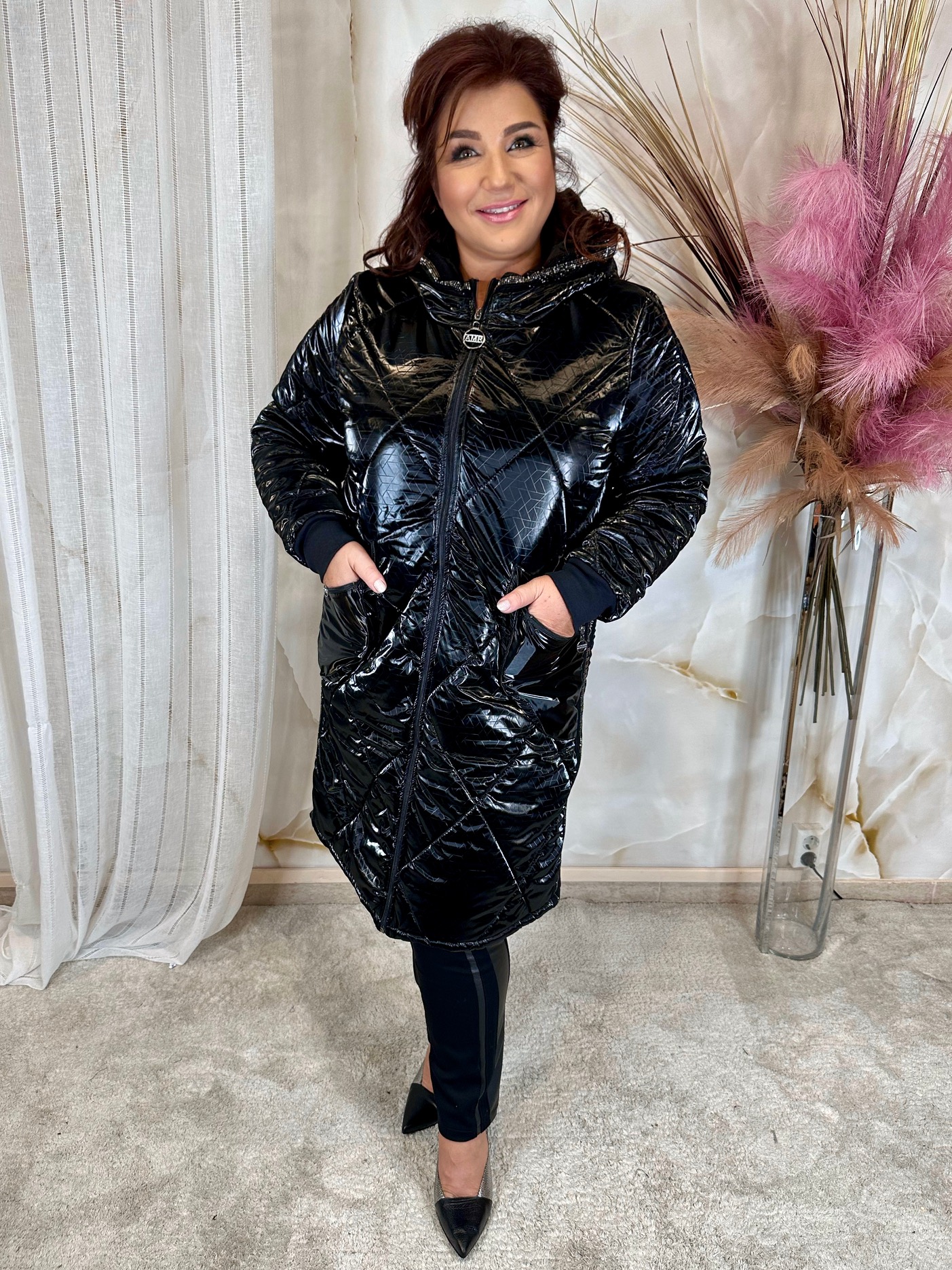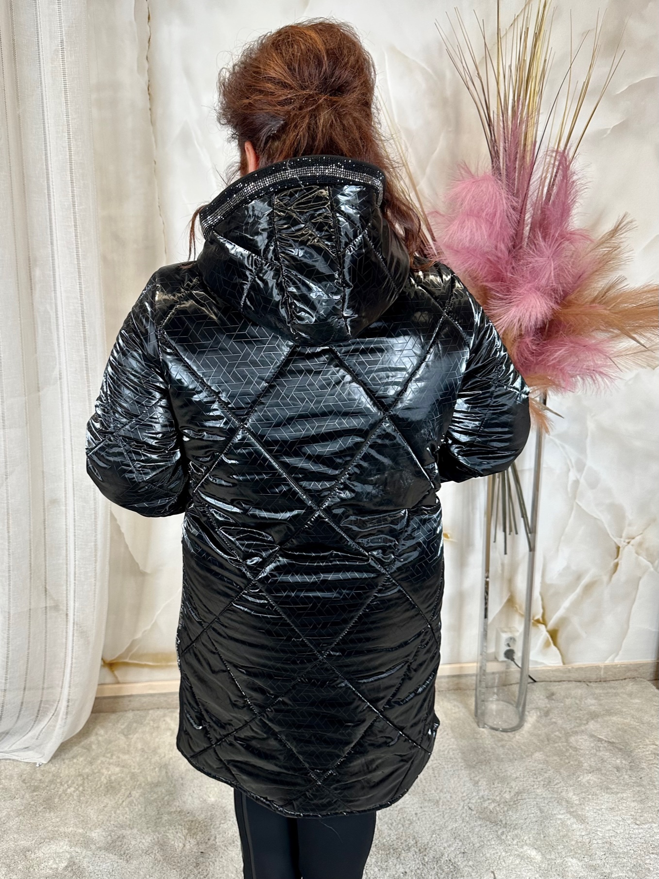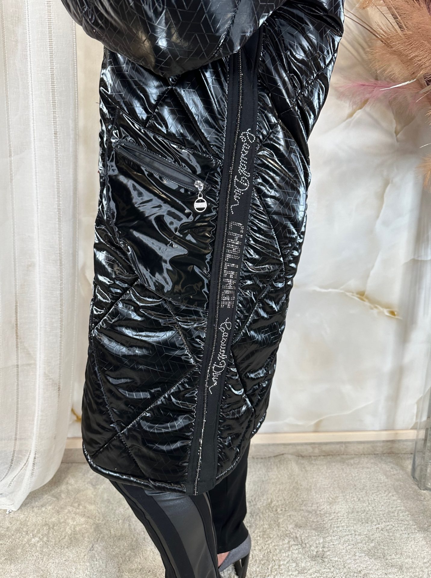 2024.10.10.Hosszú fekete selyemfényű kabát kapucnival, kristályokkal