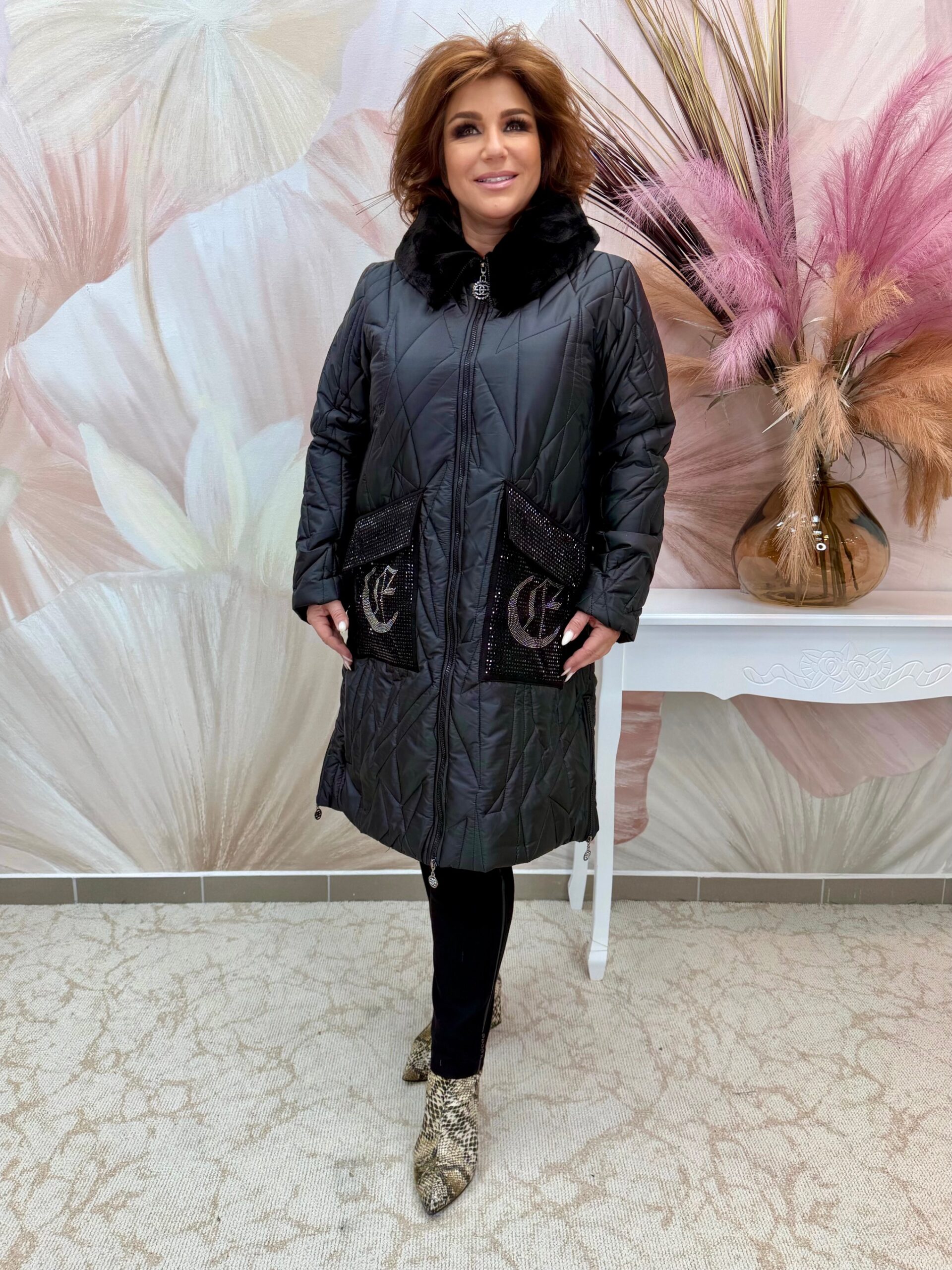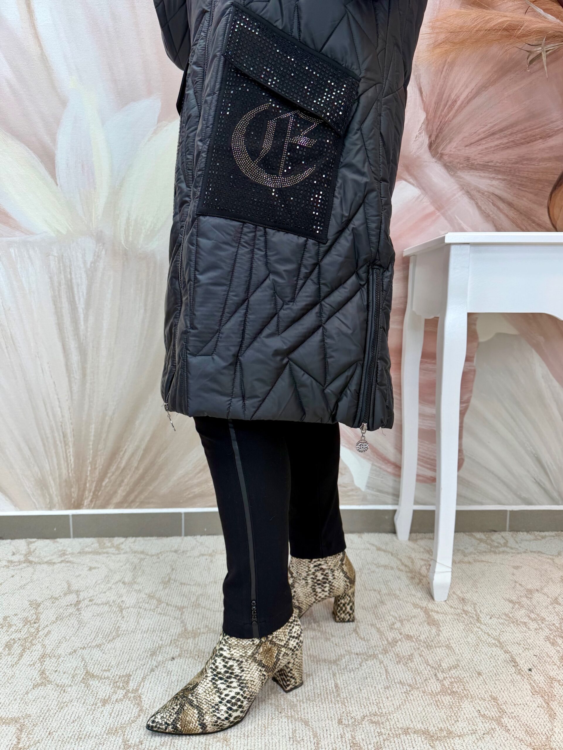 2025.10.30.Hosszú fekete steppelt kabát kristályos zsebekkel