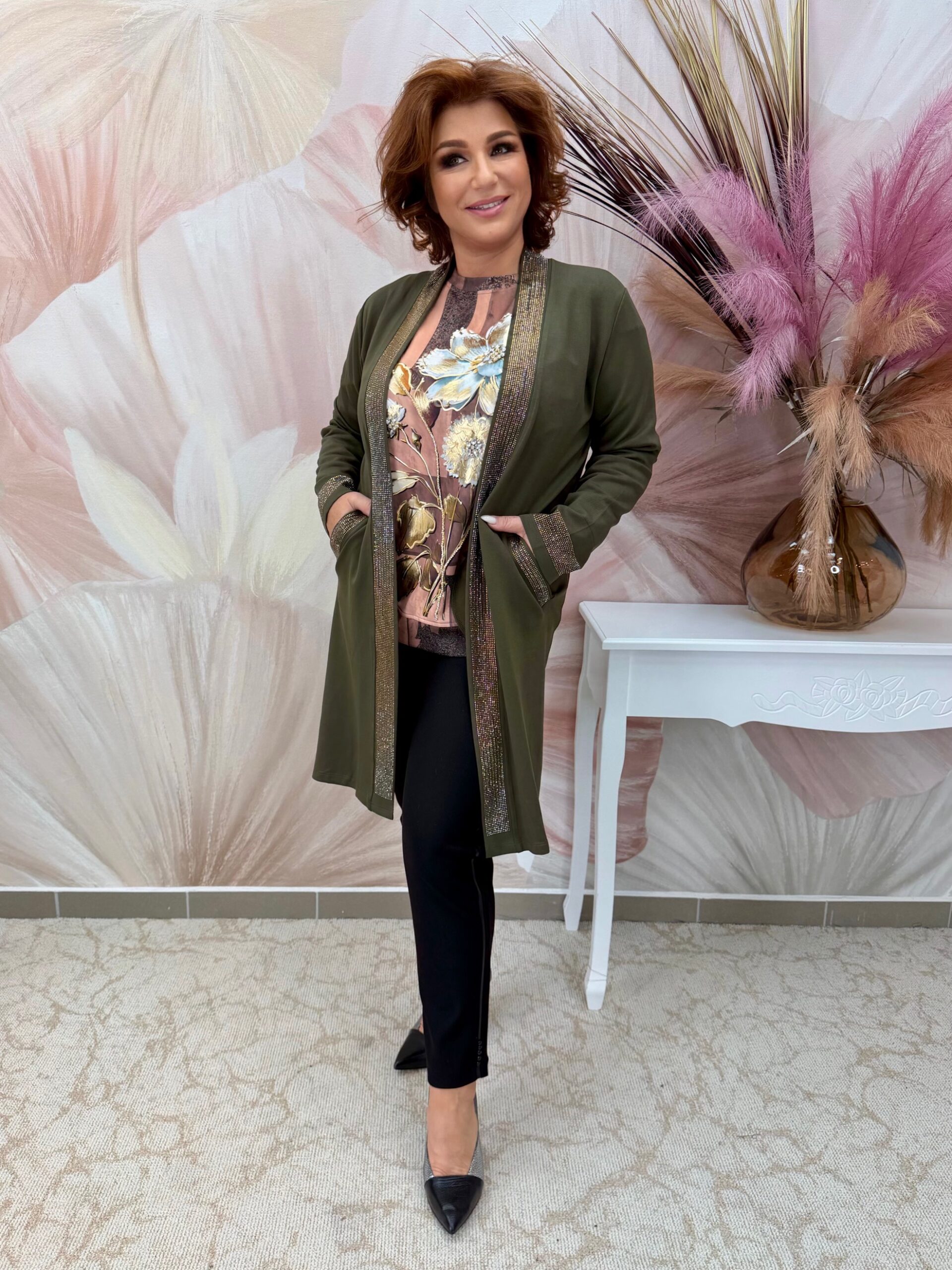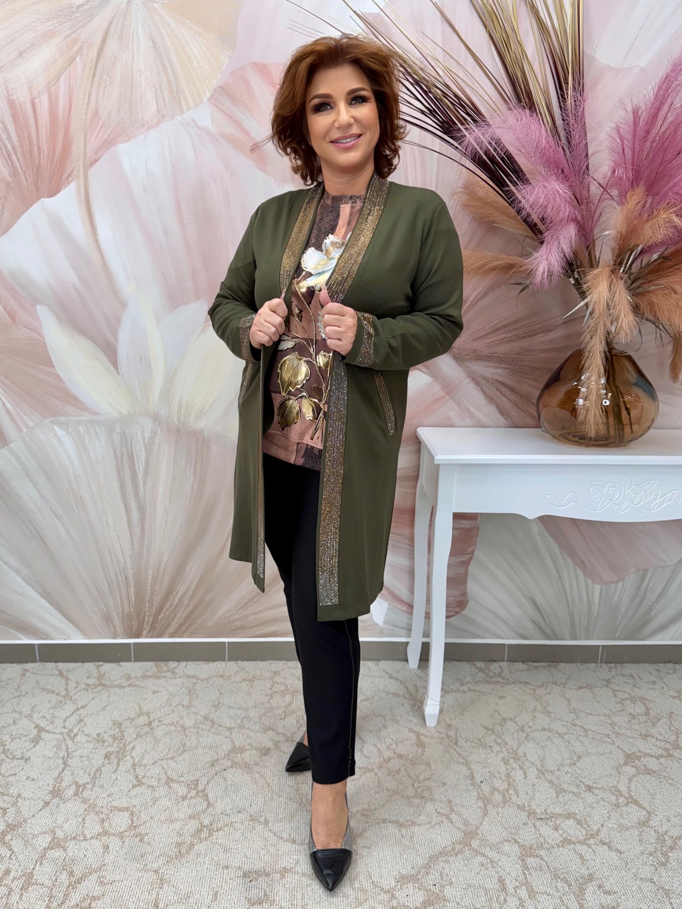 Hosszú olívazöld pamut kardigán arany és króm kristályokkal