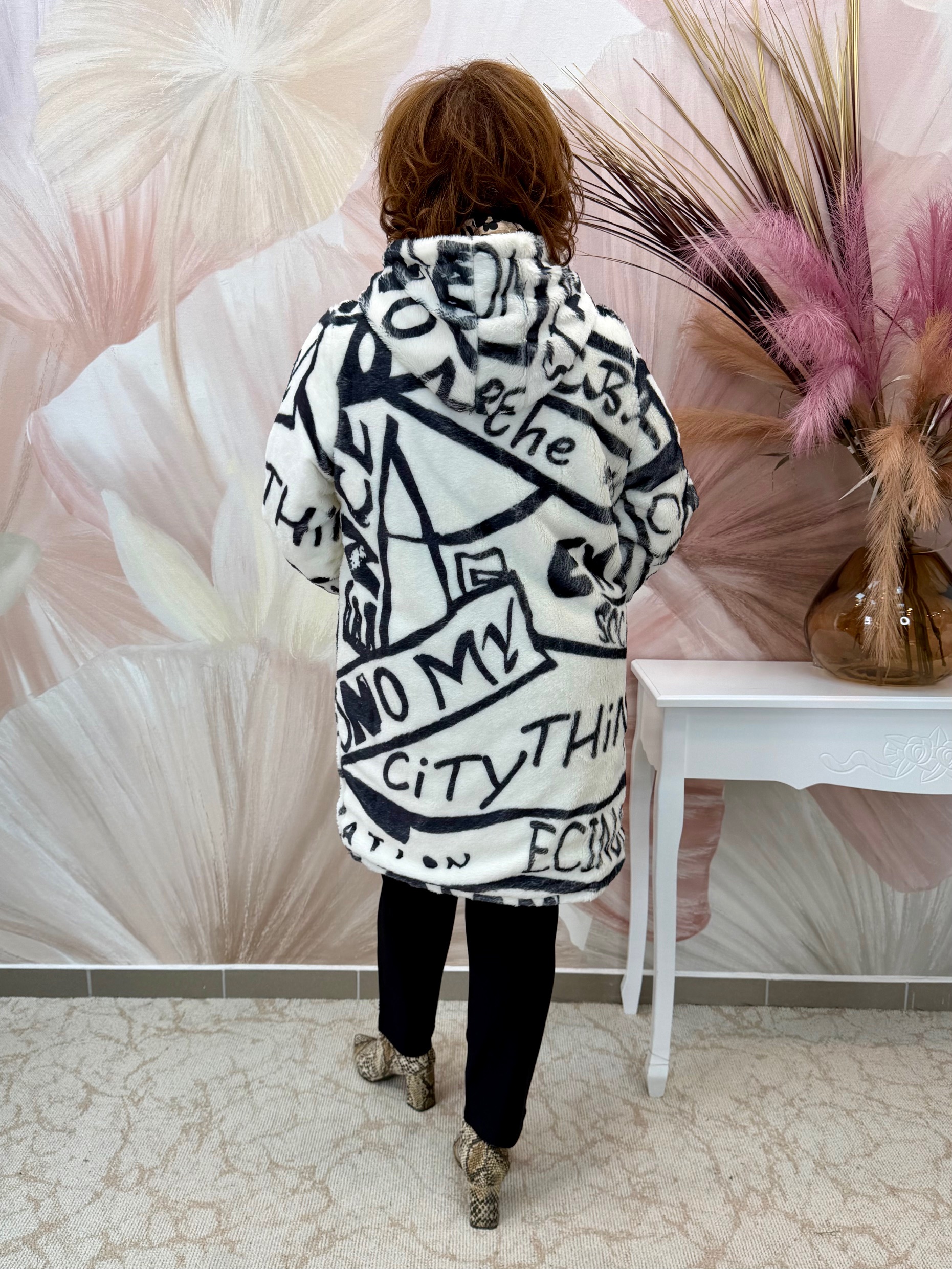 Krémszínű feliratos szőrmekabát, és egyben egy steppelt ocelotmintás kabát