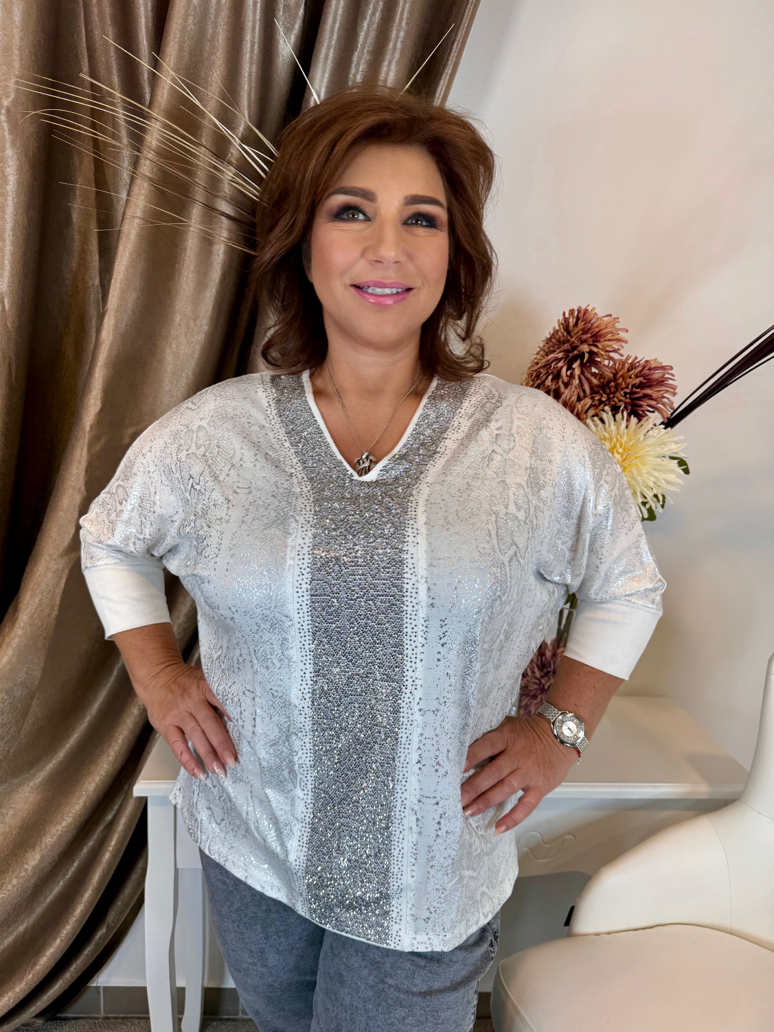 2025.08.15.Kígyómintás fehér felső ezüst kristályokkal