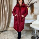 Letisztult piros steppelt kabát fekete szőrmével