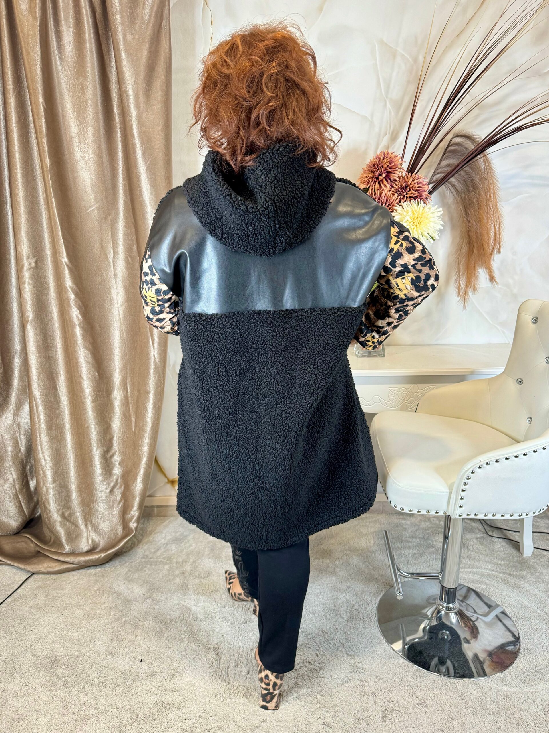 Hosszú fekete szőrme mellény