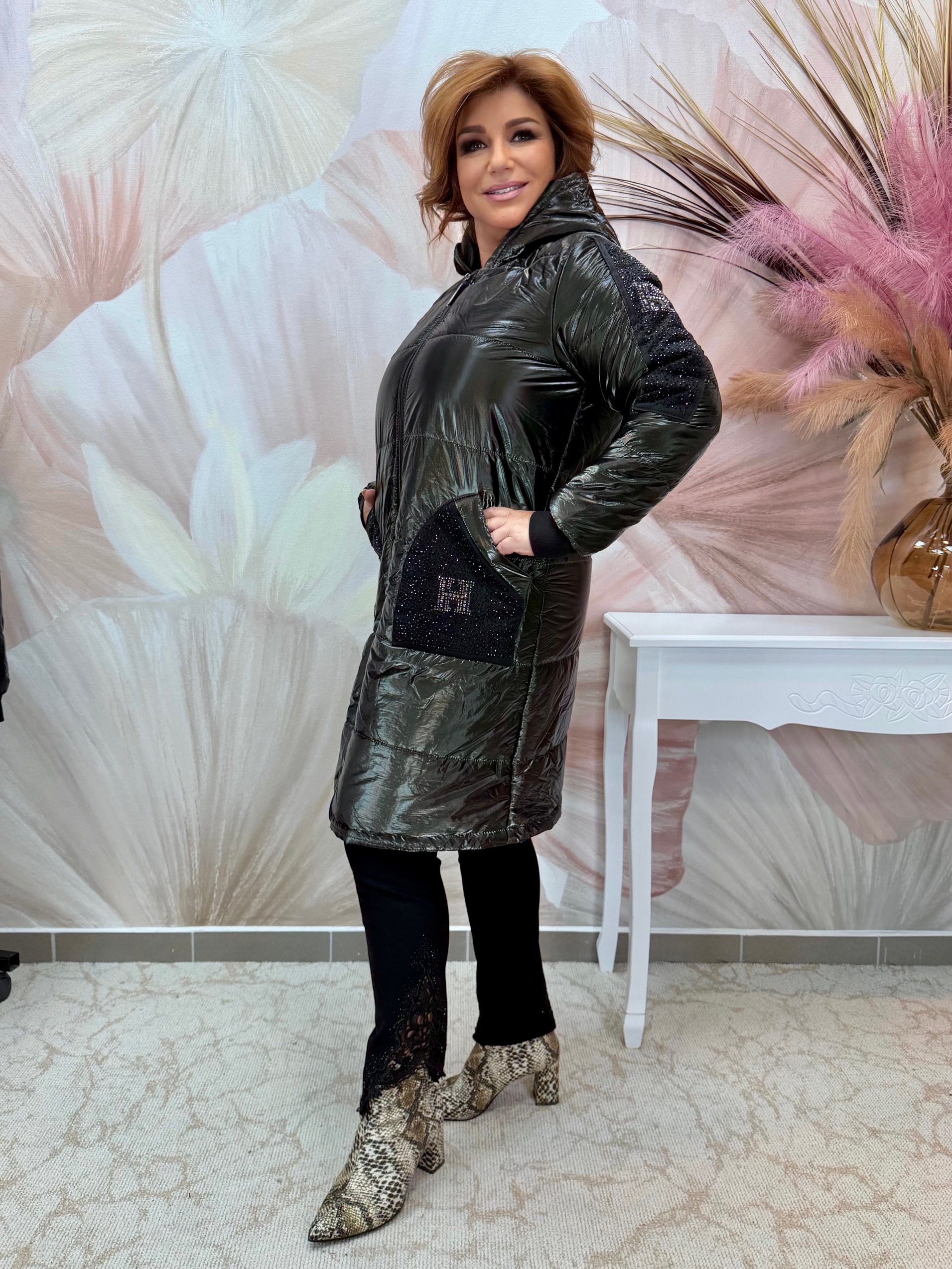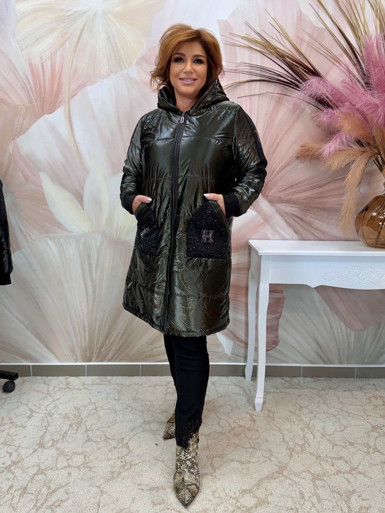 2025.11.06.Olajzöld selyemfényű télikabát kristályos zsebekkel
