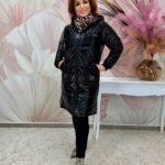 Fekete selyemfényű télikabát kristályos zsebekkel