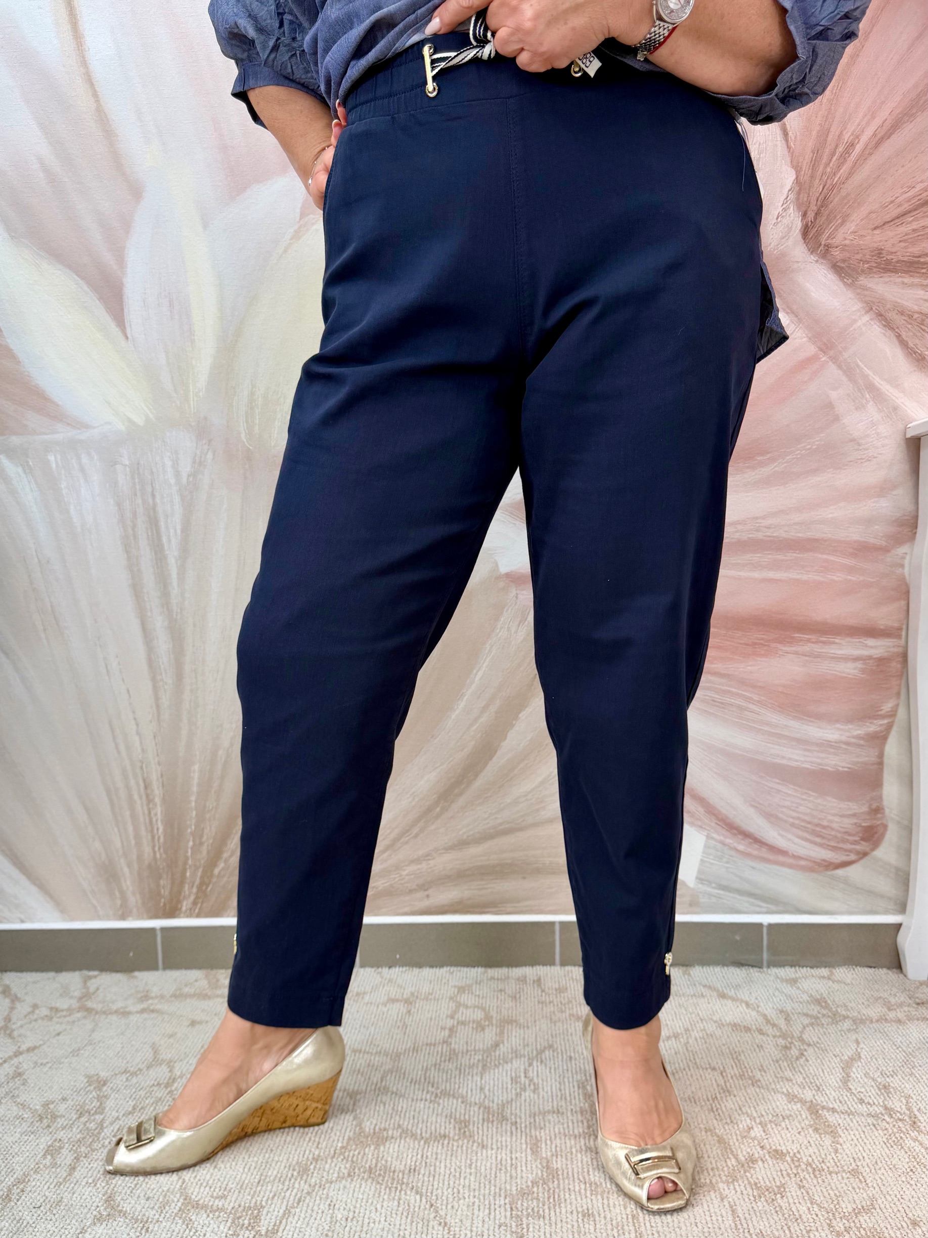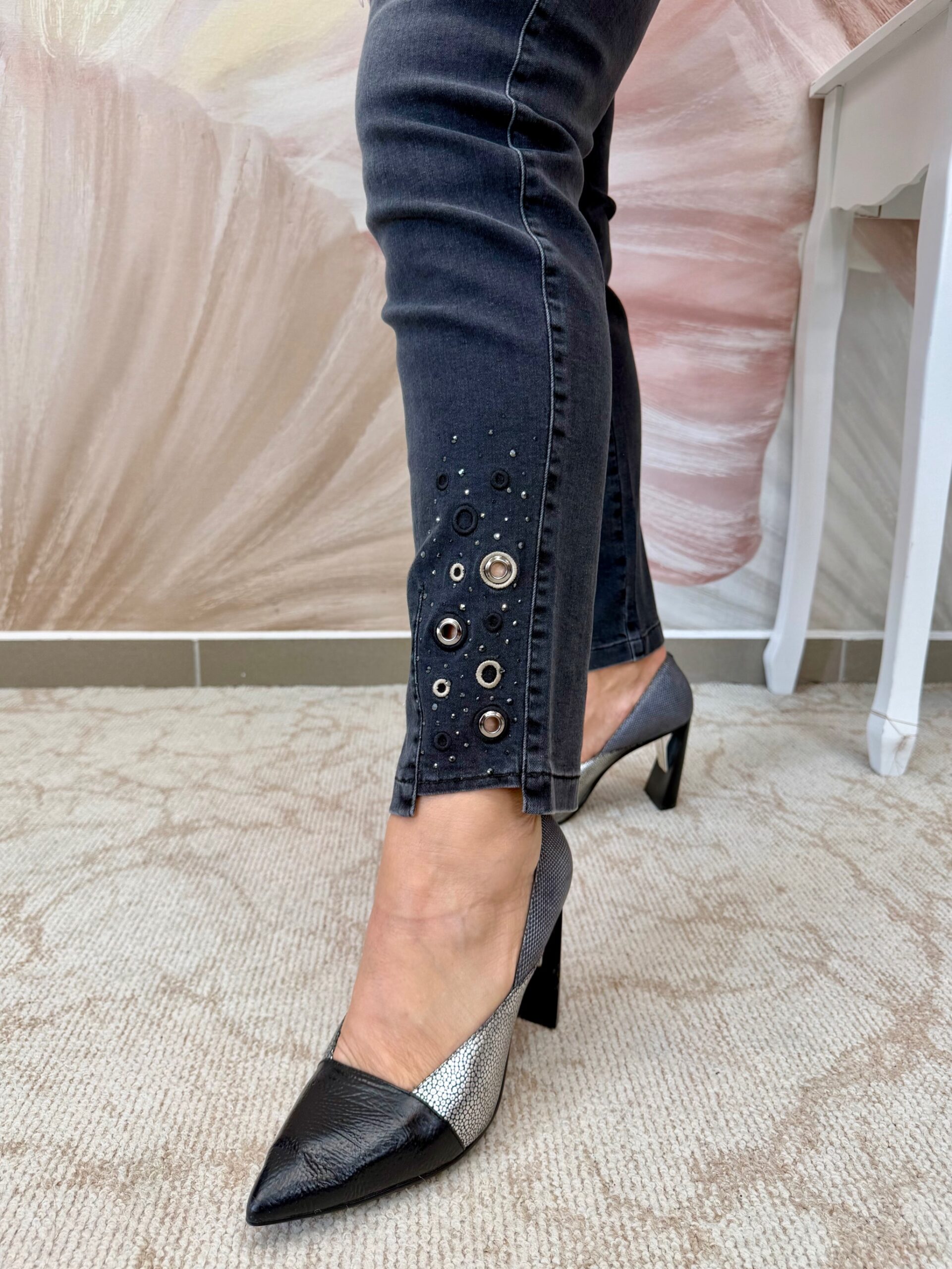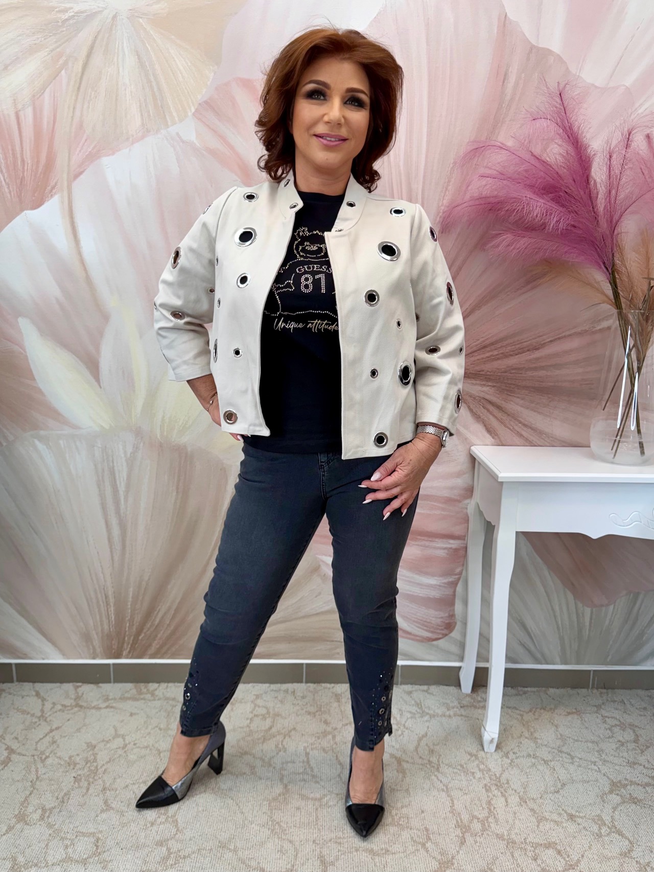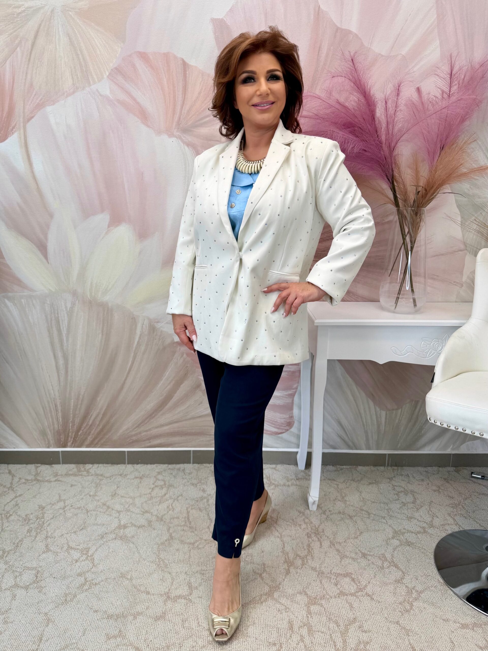 Sötétkék csíkos felső színes mintával, kristályokkal