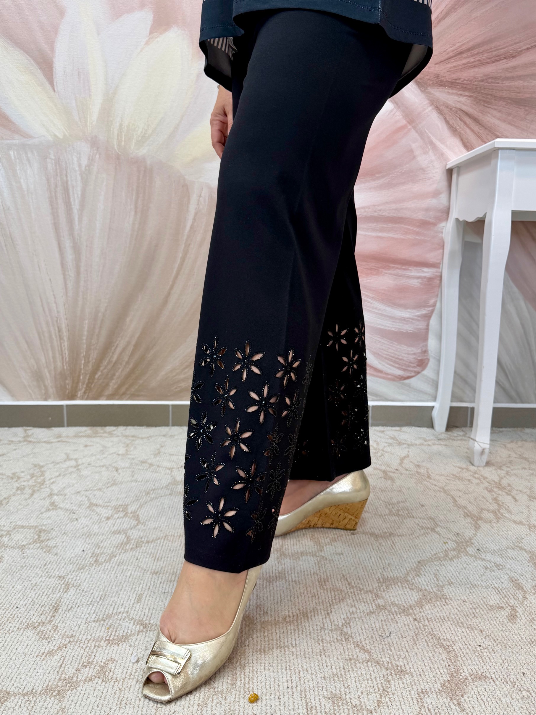 Sötét gumis derekú farmernadrág bokáján kristályokkal