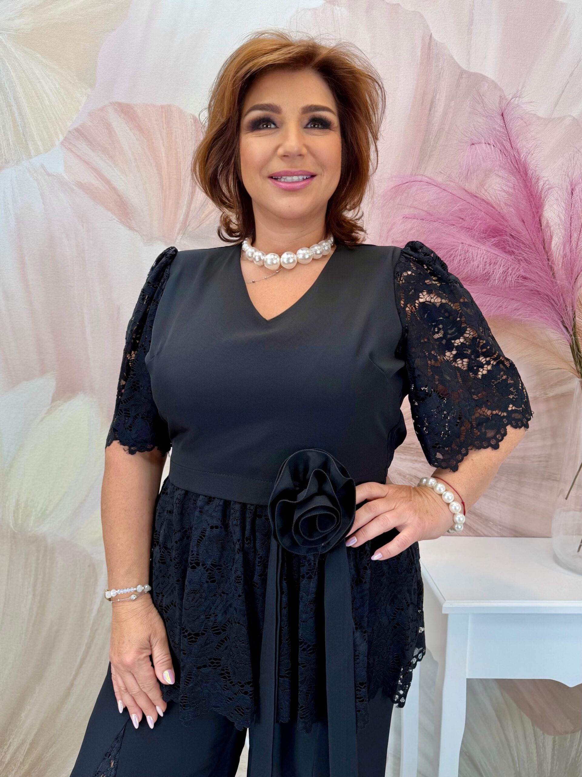 Csinos, csipkebetétes fekete nadrágkosztüm