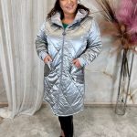 Hosszú ezüst selyemfényű kabát kapucnival, kristályokkal