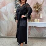 Tüllbetétes fekete szatén alkalmi ruha tollakkal