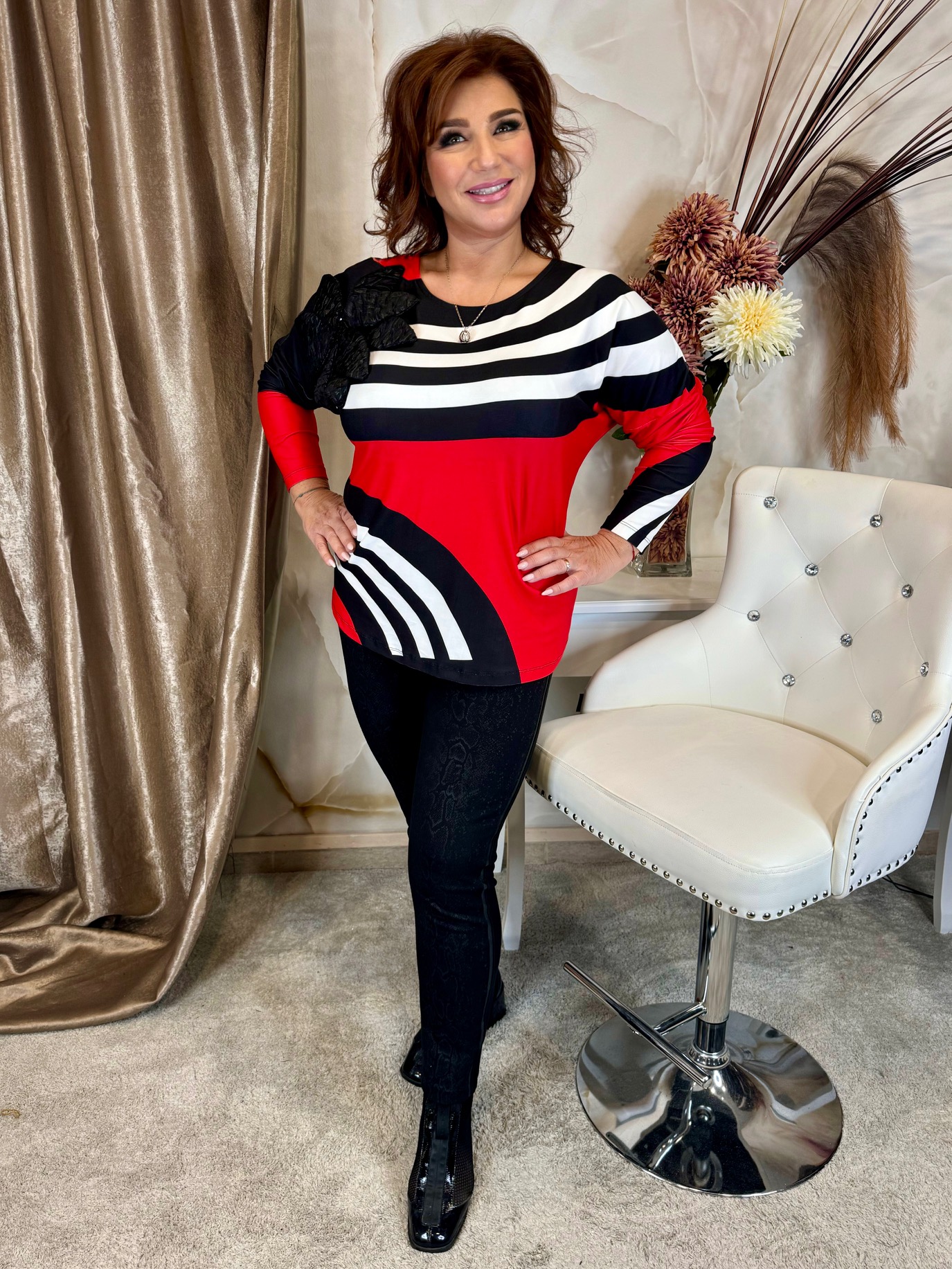 2024.11.10.Prémium piros csíkos felső fekete virágdísszel