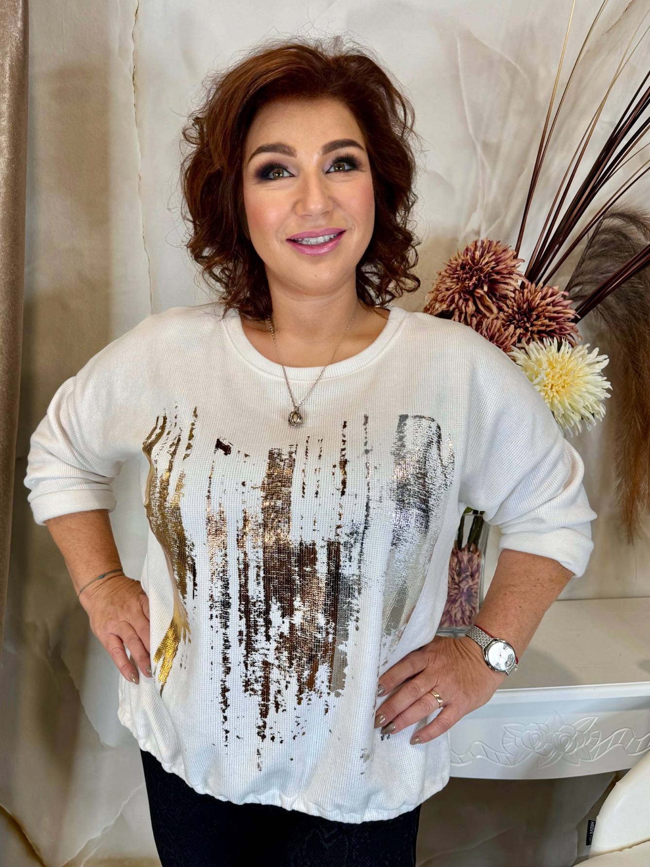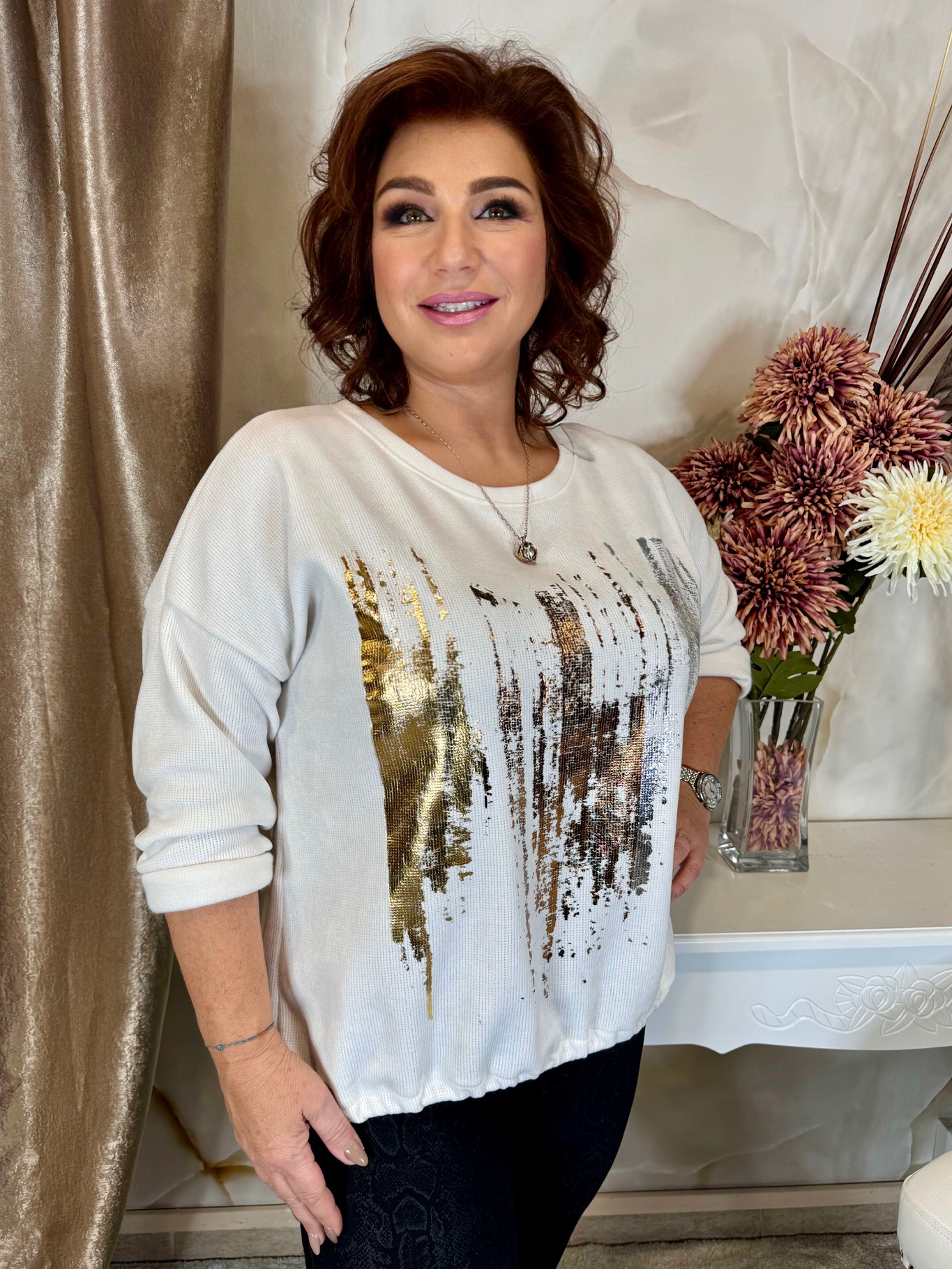 Puha fehér pulcsi bronz, arany és ezüst dísszel