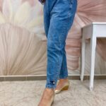 Csinos sötétszürke farmernadrág bokáján ezüst masnival