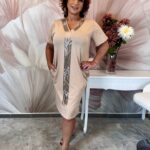 Bézs V nyakú pamut ruha állatmintás kristályokkal
