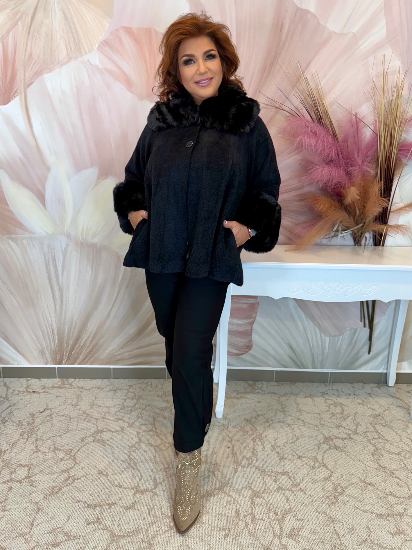2025.10.09.Szőrmés fekete kiskabát/poncsó