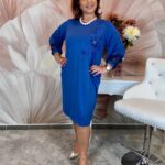 Kék elasztikus virágmintás ruha csipkés ujjakkal