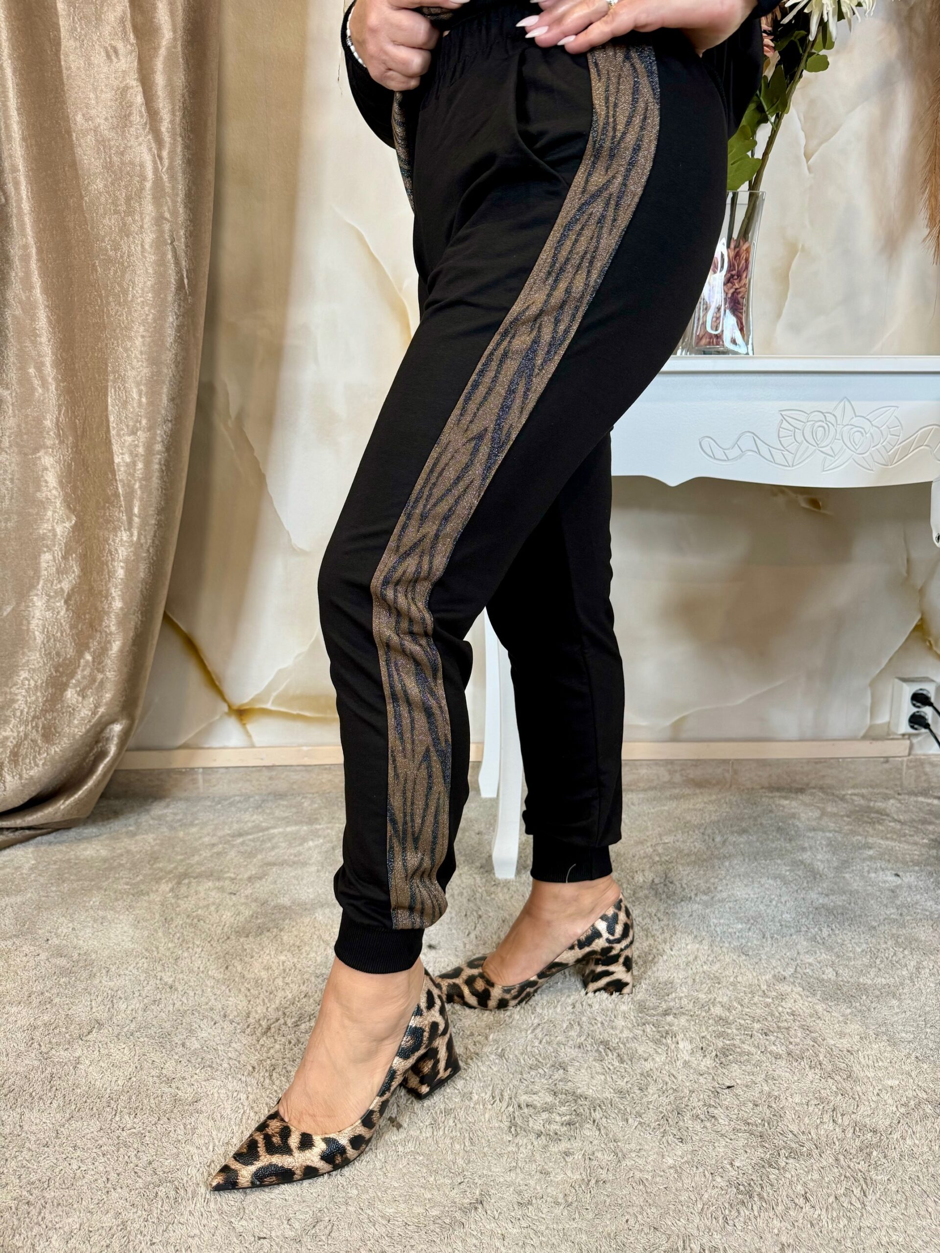 Gumis derekú nadrággal, elasztikus pamutból, oldalán tigrismintával, bokáján passzéval