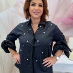 Tölcsér ujjú fekete blúz ezüst strasszokkal