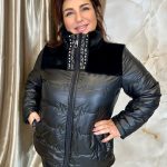 Fekete rövid téli kabát szőrmével és nyakrésznél kristályokkal