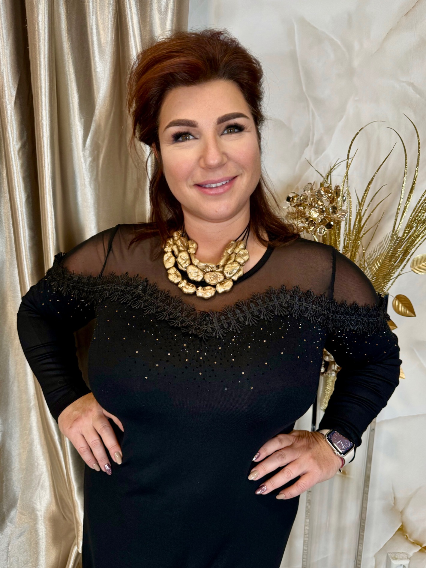 Tüll és csipke betétes elasztikus alkalmi ruha, elasztikus pamutból, arany kövekkel