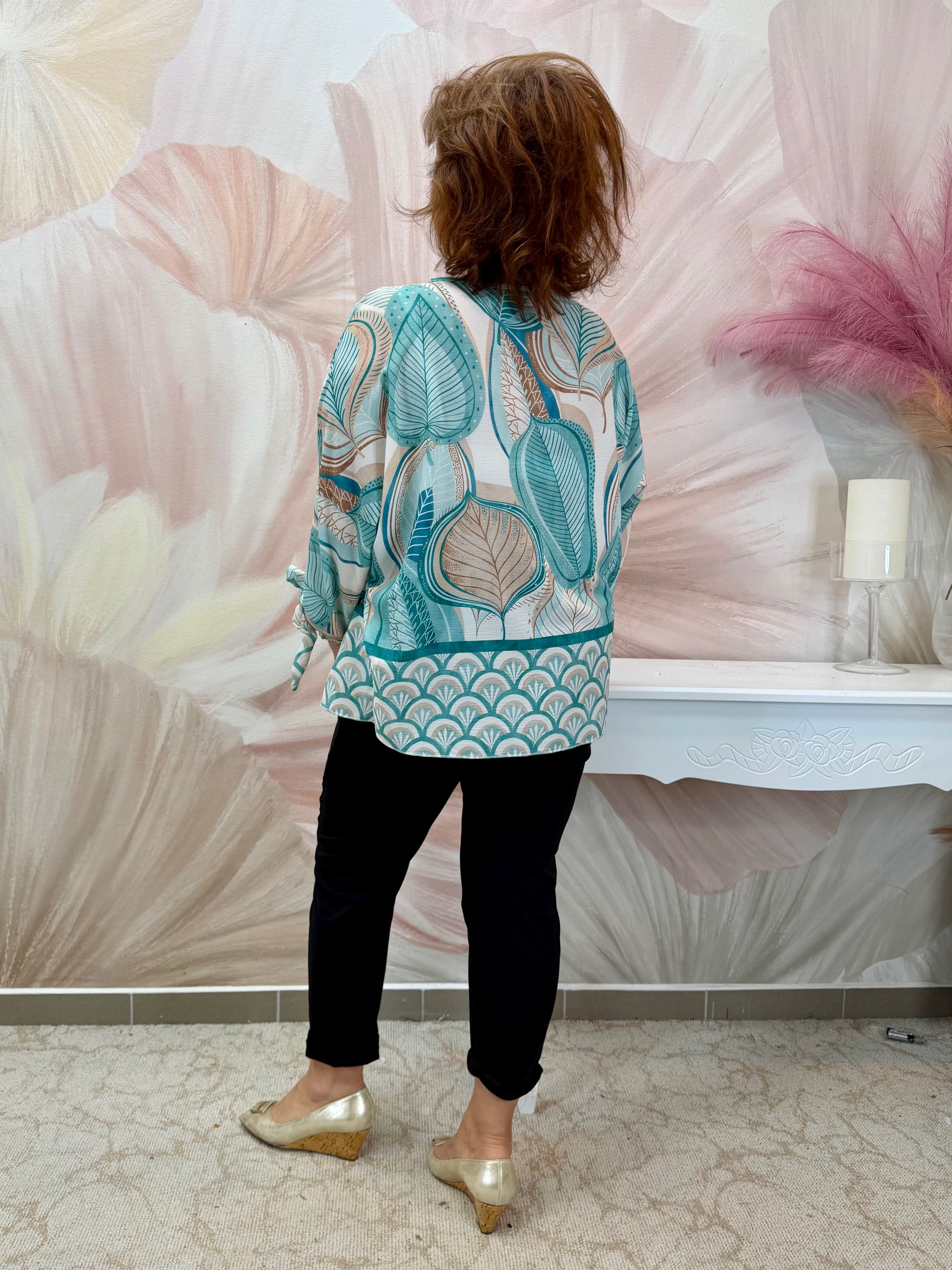 2026.02.15.Türkiz mintás lenge felső zippes dekoltázzsal