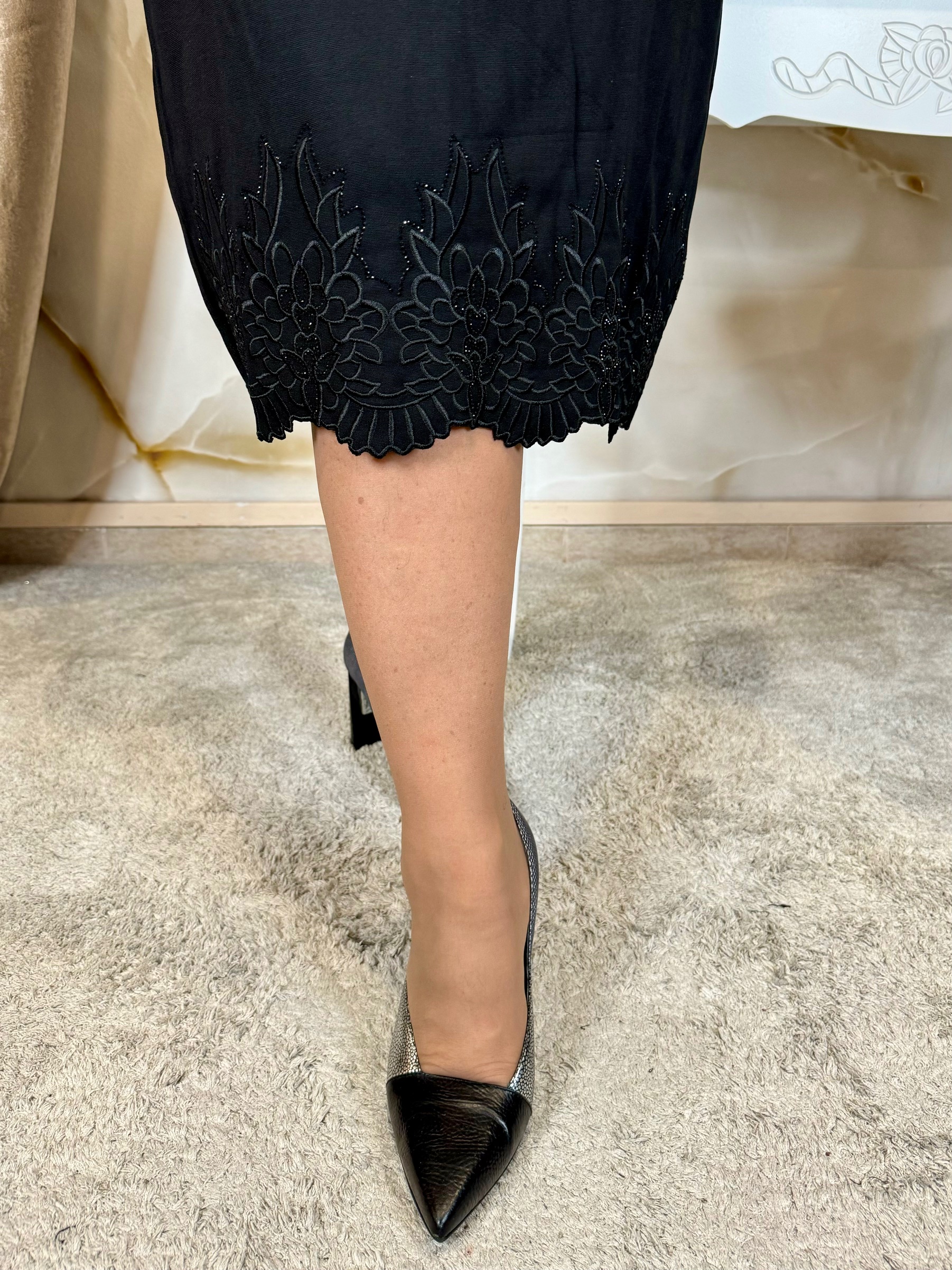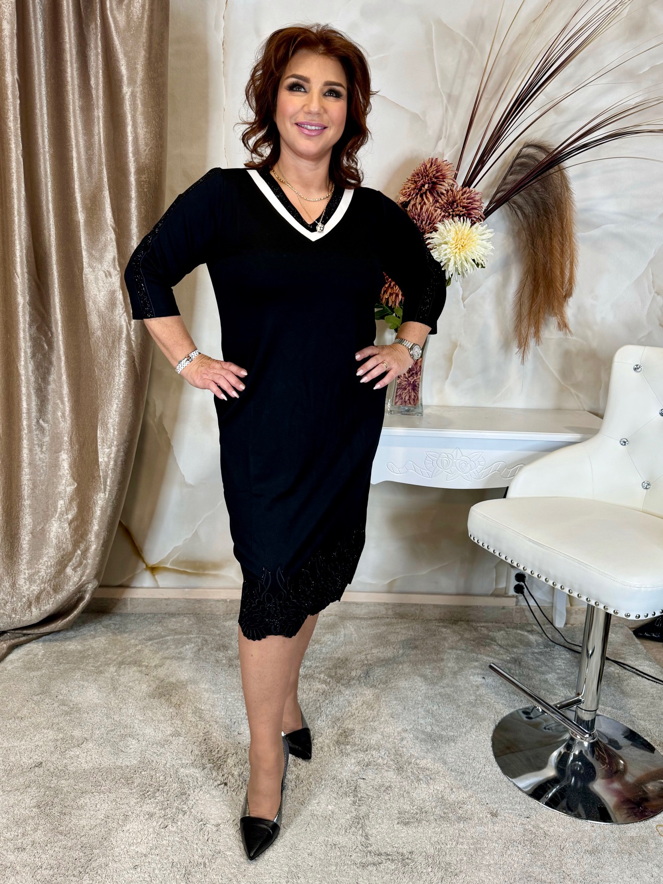 2024.11.17.V nyakú csinos fekete ruha alján különleges dísszel