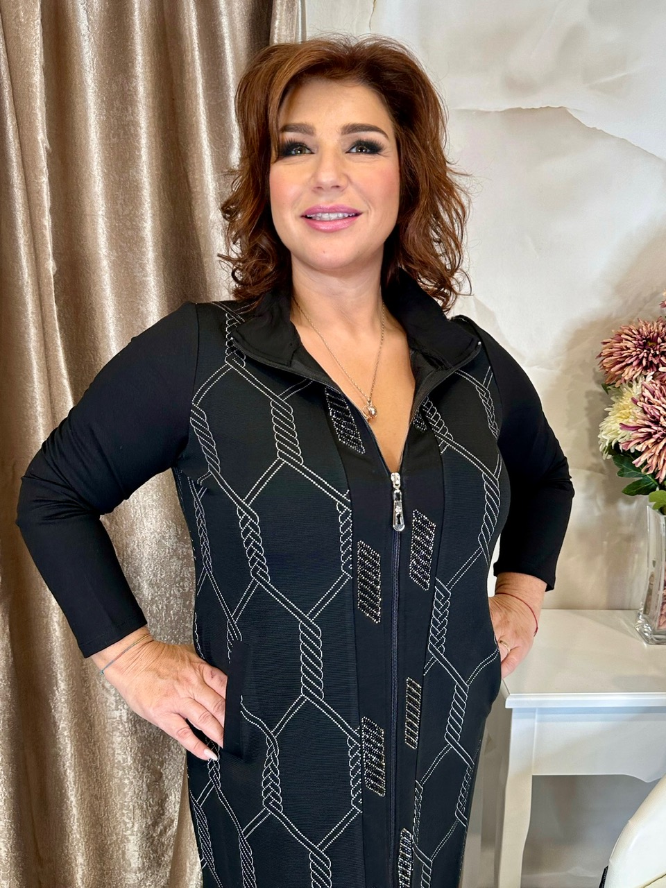 Végig zippes csinos láncmintás ruha ezüst kristályokkal