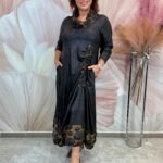 Grafitszürke bőrbetétes alkalmi ruha fekete bársonyos mintával ezüst kristályokkal