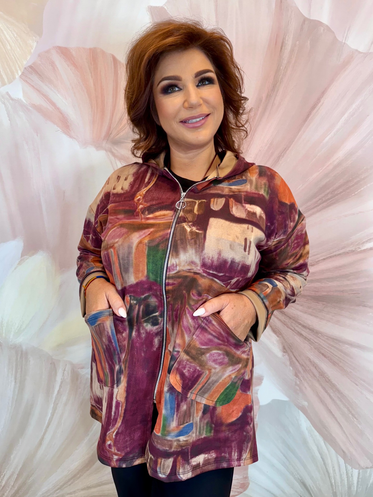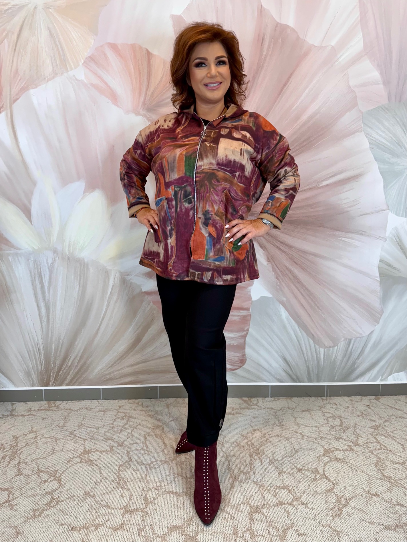Zippes hasított textilbőr kiskabát – bordó mintás