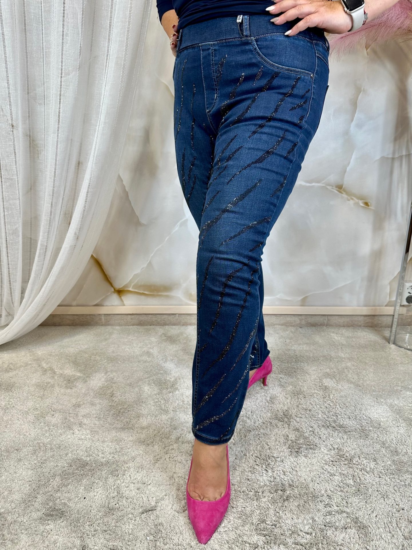 Kristályköves, gumis derekú, elasztikus farmernadrág