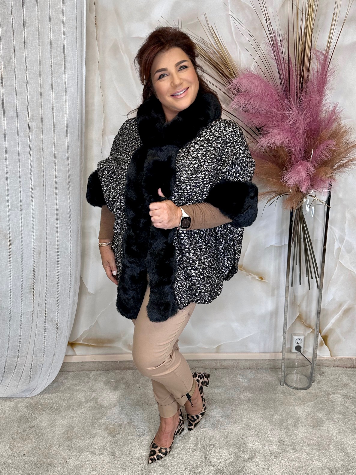 Fekete-fehér poncsó, fekete szőrmével